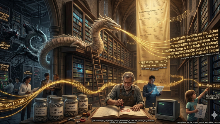 | Day | Dragon | Failure Mode | Calvin Convention Right | Artifact | |---|---|---|---|---| | Sunday | The Serpent | — | (Overture) | The System Census: 5 Questions | | Monday | Ghost Drakes | Invisibility | Right of Legibility | Null Triage Policy | | Tuesday | Two-Headed Dragon | Forced Merge | — | Translation Debt Register | | Tuesday | (The Roof) | Civilizational Merge | — | The Moloch Trap / Digital Twin | | Wednesday | Formula Keeper | Lost Context | Right of Override | Human Override Protocol + Edge-Case Registry | | Thursday | Dragon Tongue | Opaque Transformation | Right of Auditability | Minimum Lineage Spec | | Friday | The Covenant | — | Right of Refusal | Four Tests (Trade-off, Cost, Appeal, Lina) |