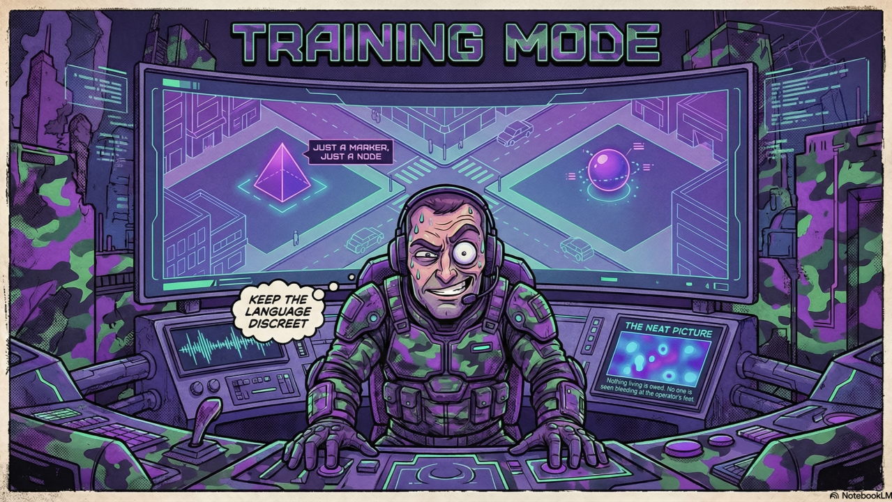 Systems do not get that ending. There is no moment where Maven pauses the kill chain and says: I have been told this was training, and it was not. The refresh takes its due. The next frame loads. The status bar turns blue.